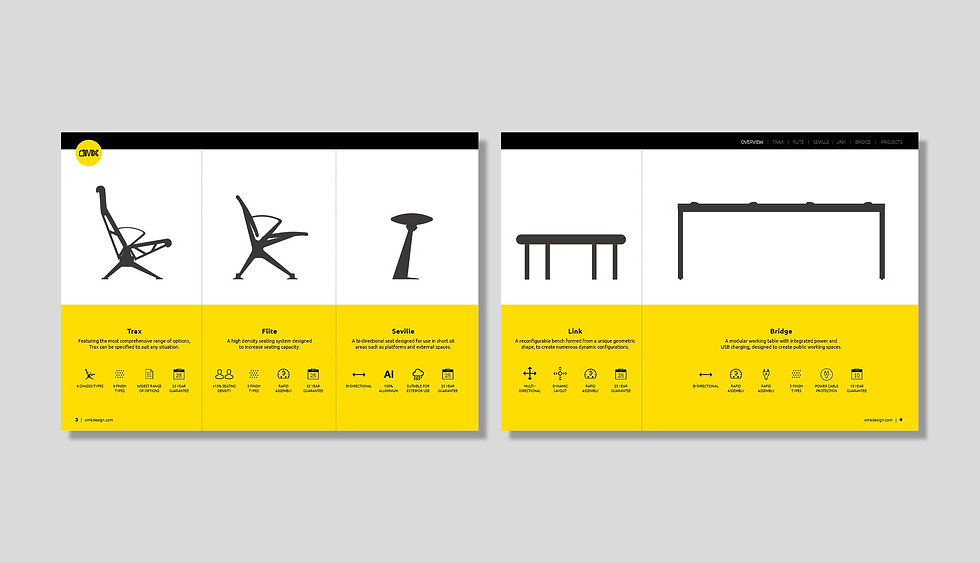 OMK are specialists in public seating, providing design led solutions to the furniture industry since 1965. As a global brand with an iconic designer at the heart of the business the marketing material and website needed to reflect its strength within the industry.